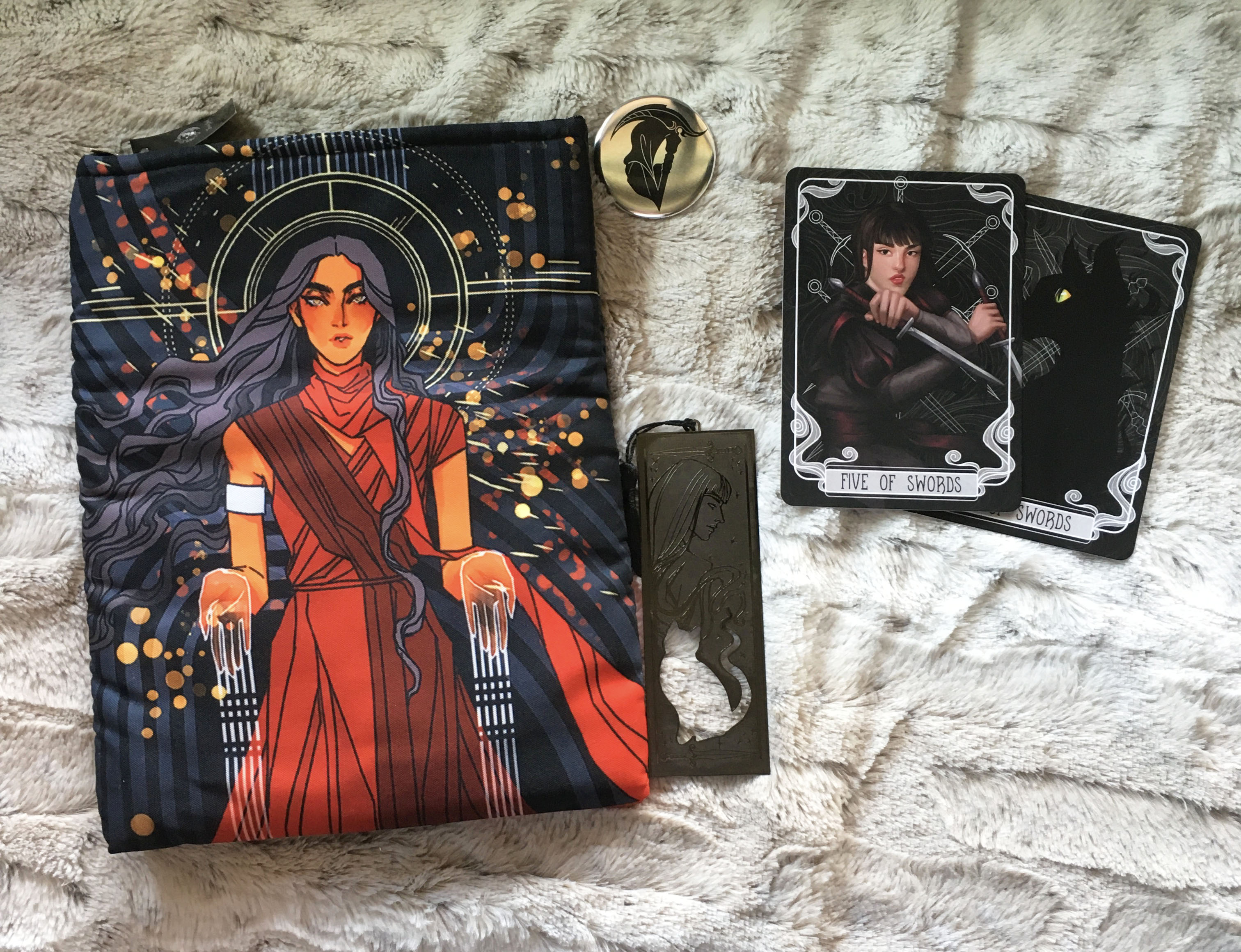 The bookish items included this month are a Nevernight bookmark, a golden egg bath bomb, an Aurora Rising pin, a notebook inspired by Stalking Jack the Ripper, a Scythe magnet, and An Ember In the Ashes book sleeve. Each month also includes two tarot card this month featuring Mia and Mr. Kindly from Nevernight.
