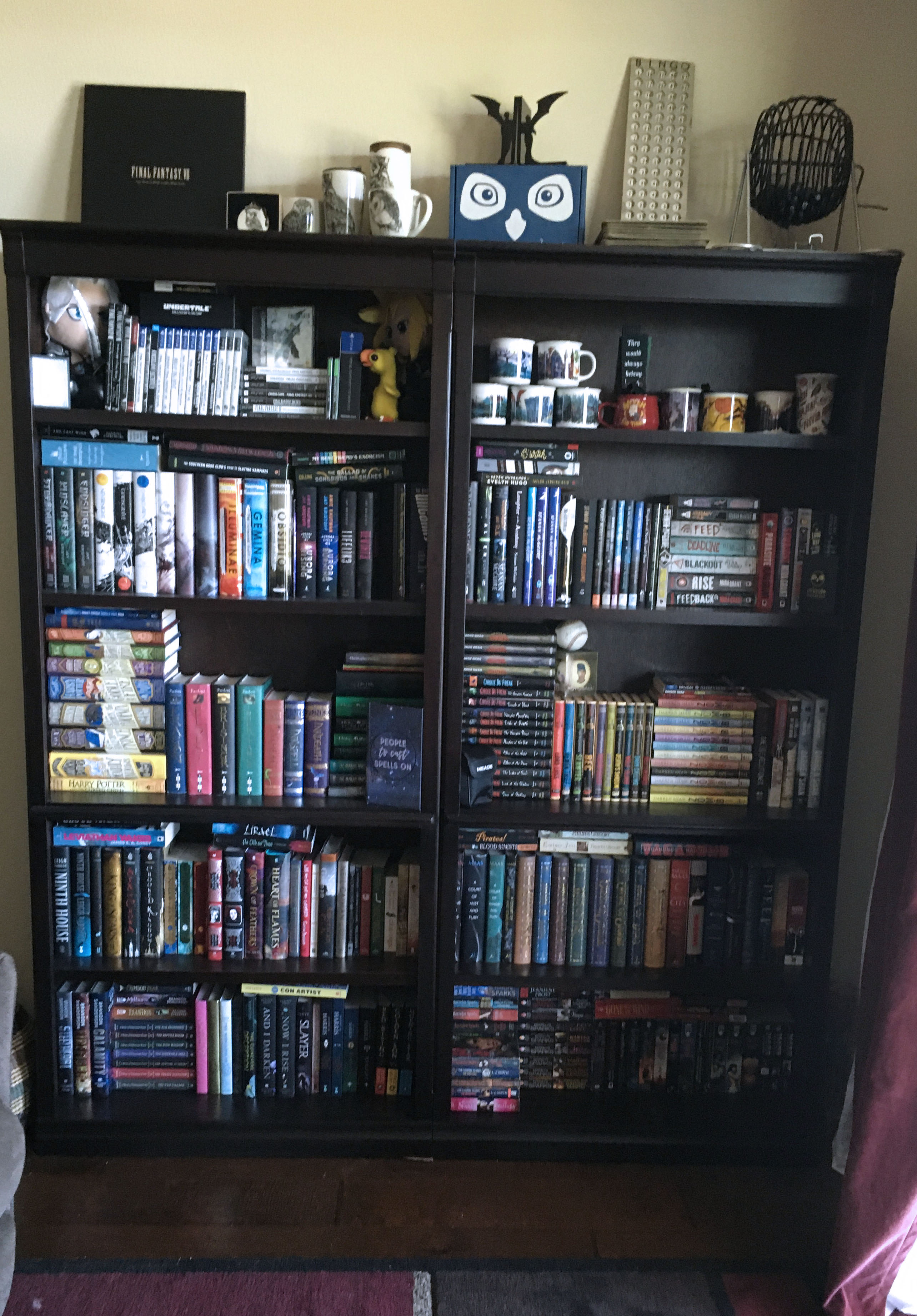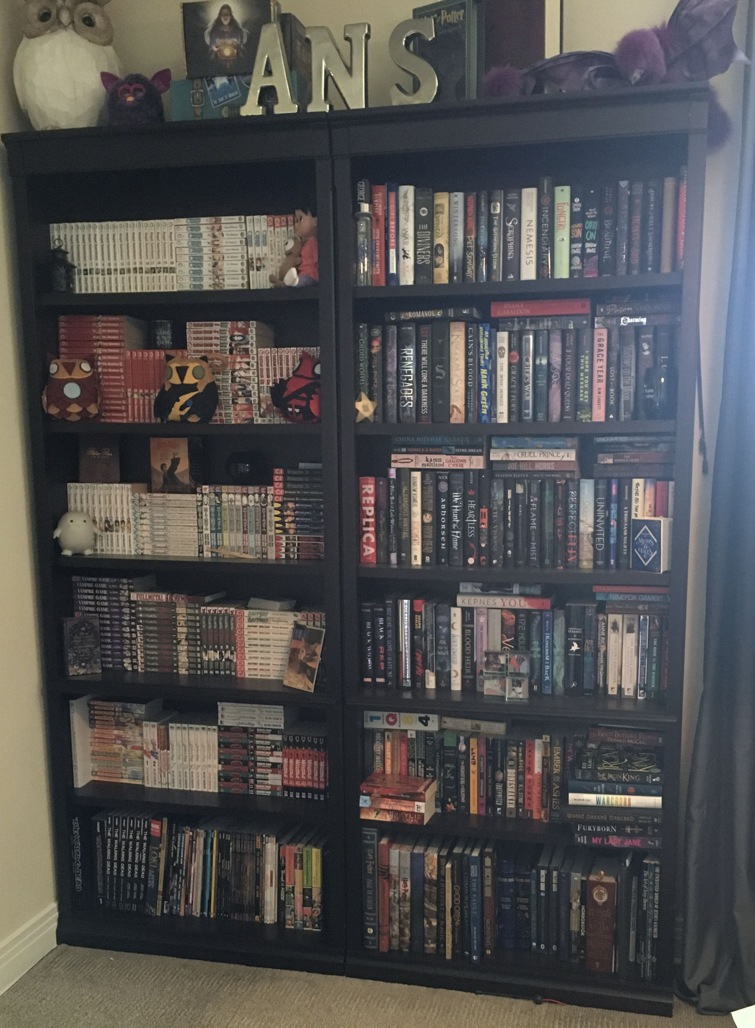 My organization system works for me but I don’t think that it would work for many others. I first have separated all of my comics, manga, and lager coffee table type books from everything else. After that I organize by author and series so that all the books that I have by the same author and same series are together. If I don’t have enough books by one author for their own shelf I put other books or series that I feel fit best with them. Finally, all the books that I don’t have the next in the series or others from that author are organized by height starting with hardback and going to paperbacks. The only exception is that most of my mass-market books are on the same shelf.