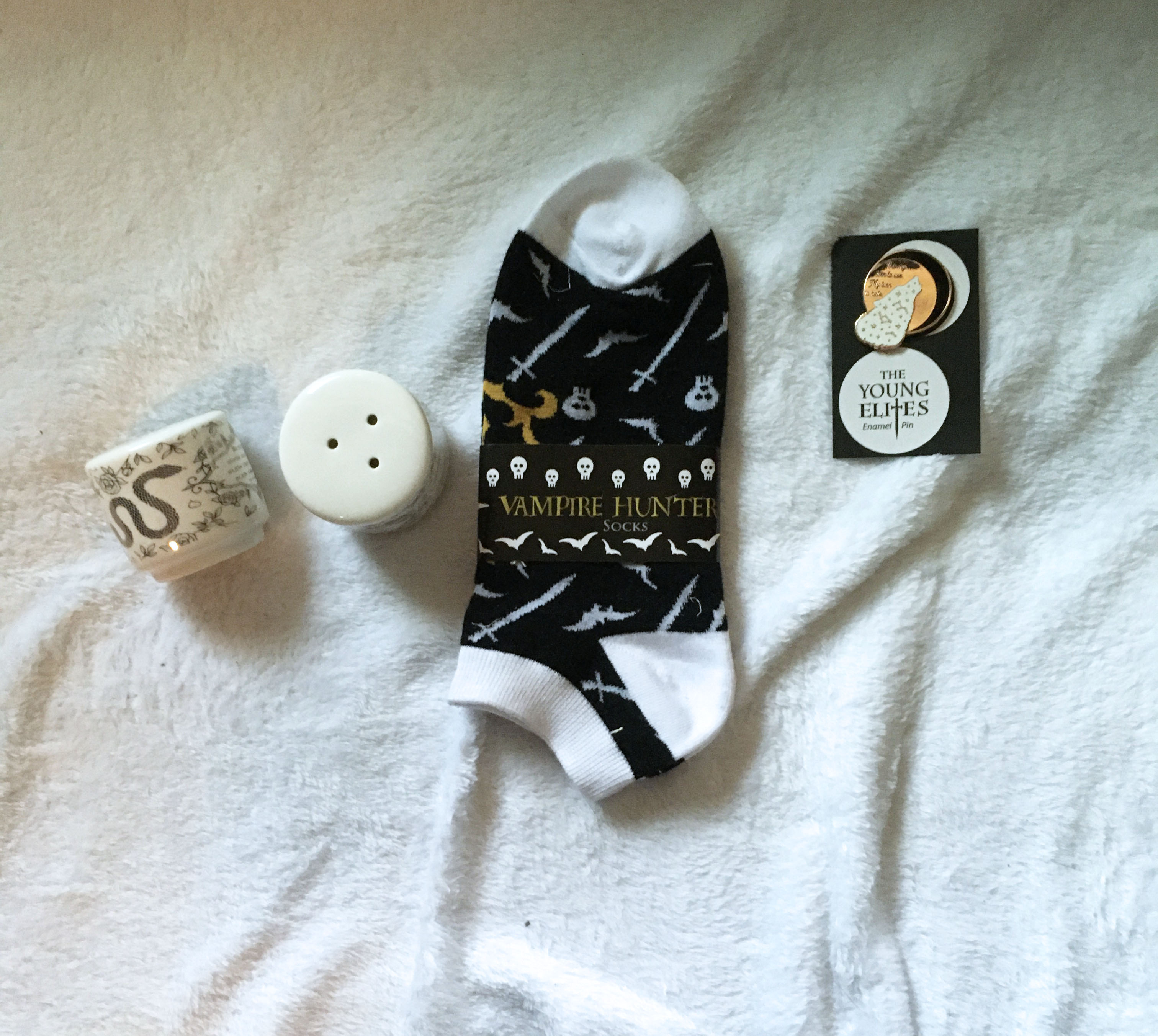 The bookish items included this month are Kingdom of the Wicked salt and pepper shakers, foiled playing cards with character art from multiple fandoms, an enamel pin inspired by The Young Elites, a puzzle featuring the character Jacks from Carval, Castlevania socks, a Kylo Ren sticker sheet, and tarot cards with characters from the book House of Earth and Blood. These are the type of items that I like the most both useful items that can be used again and again and some more decorative items/fandom items.