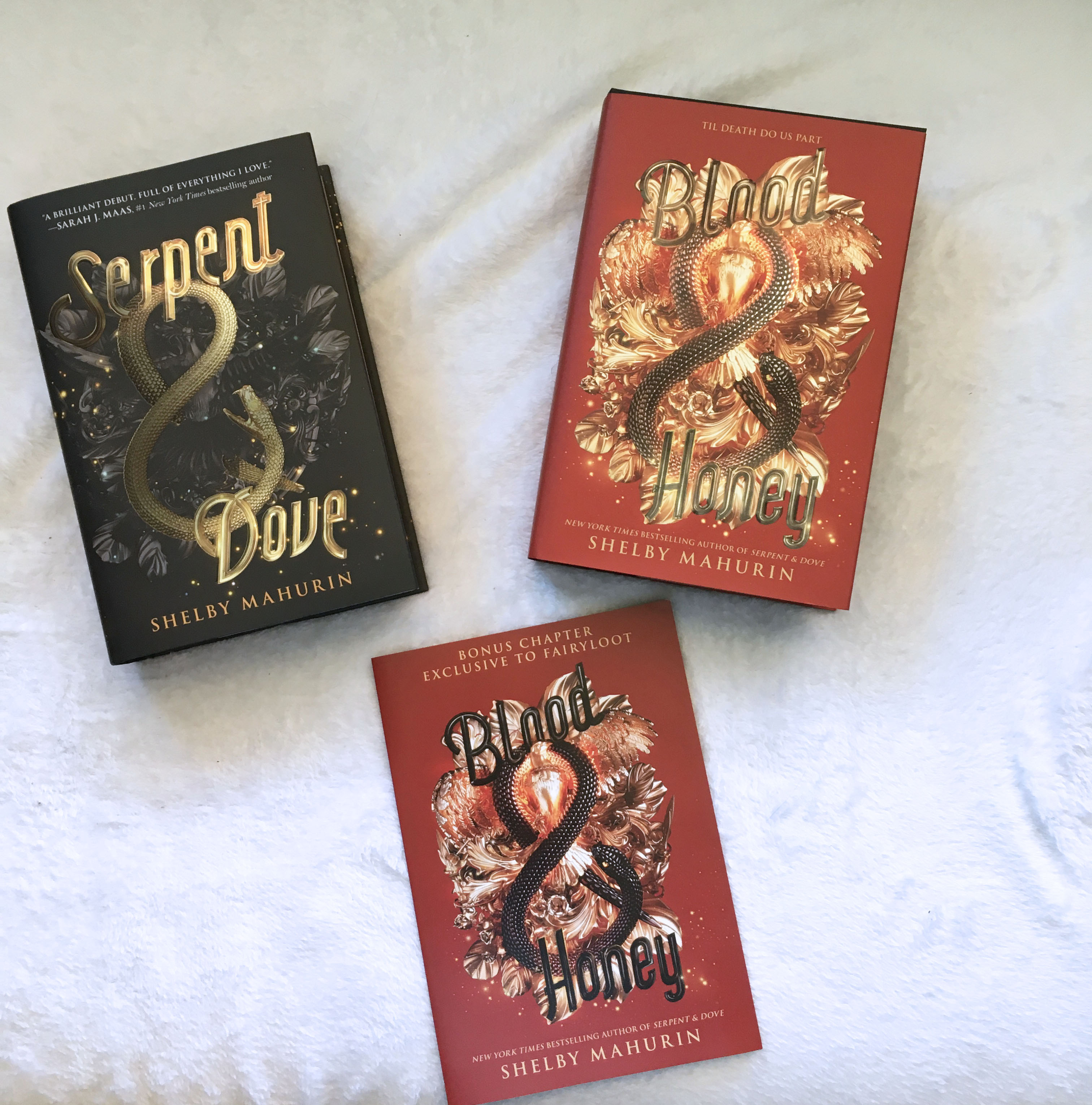 The items included in this box where a blanket, candle, an enamel pin set, a storage tin, a deck of tarot cards, and an art print. Obviously a special signed edition of Blood and Honey by Shelby Mahurin was also included. This copy of the book came with shimmery sprayed edges and art work under the dust jacket. There was also a bonus chapter that is exclusive to the Fairyloot edition. I was also lucky enough to get the Serpant and Dove add on which also came with sprayed edges and a signed book plate.