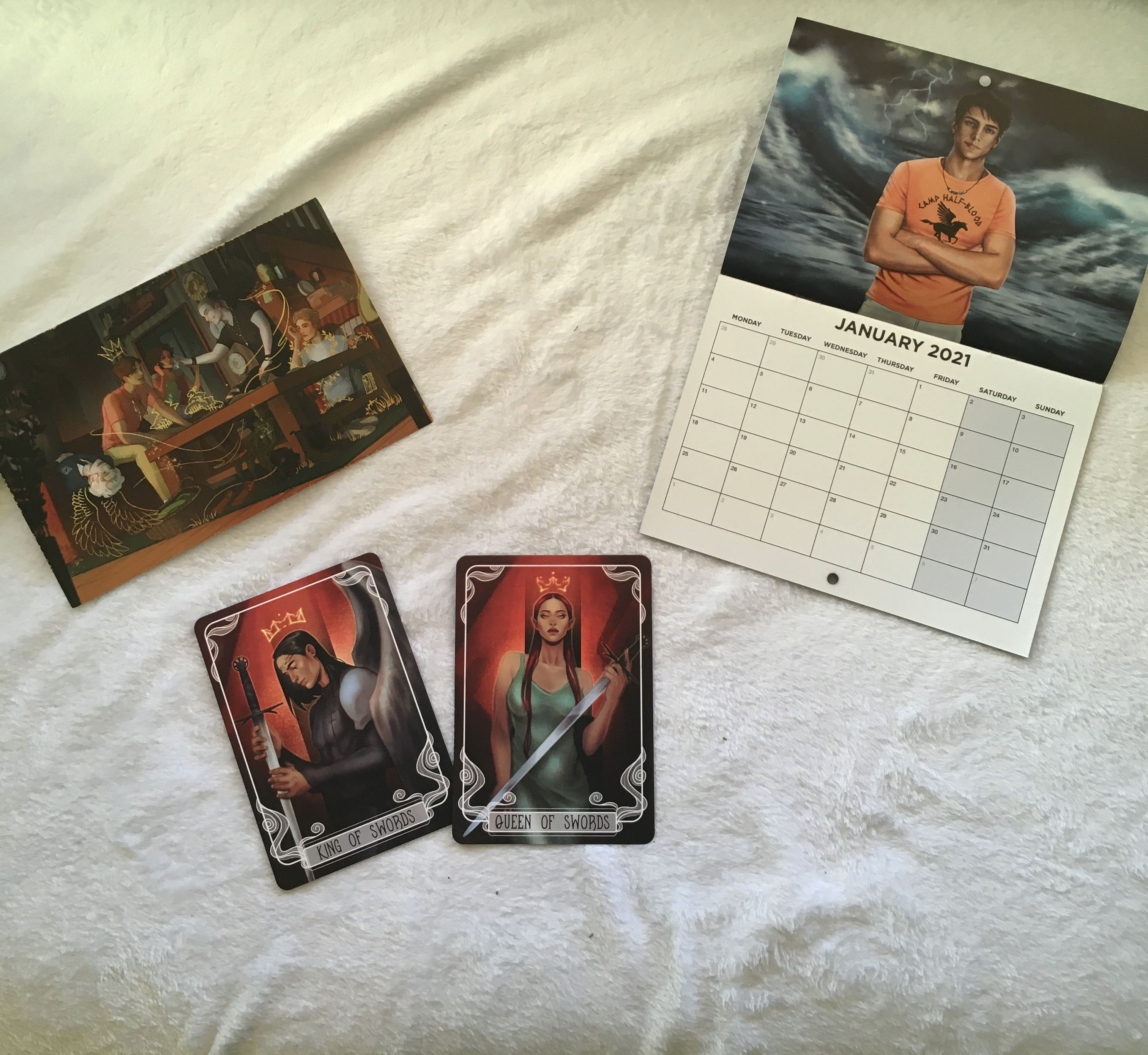 The bookish items included this month are a Hobbit inspired beanie, a secret books to put things in, a Throne of Glass inspired letter opener shaped like a sword, a 2021 calendar with art from different fandoms, a Children of Blood and Bone notepad, and the art print is inspired by The Raven Cycle. The tarot card incuded in this are are have character art from House of Earth and Blood.