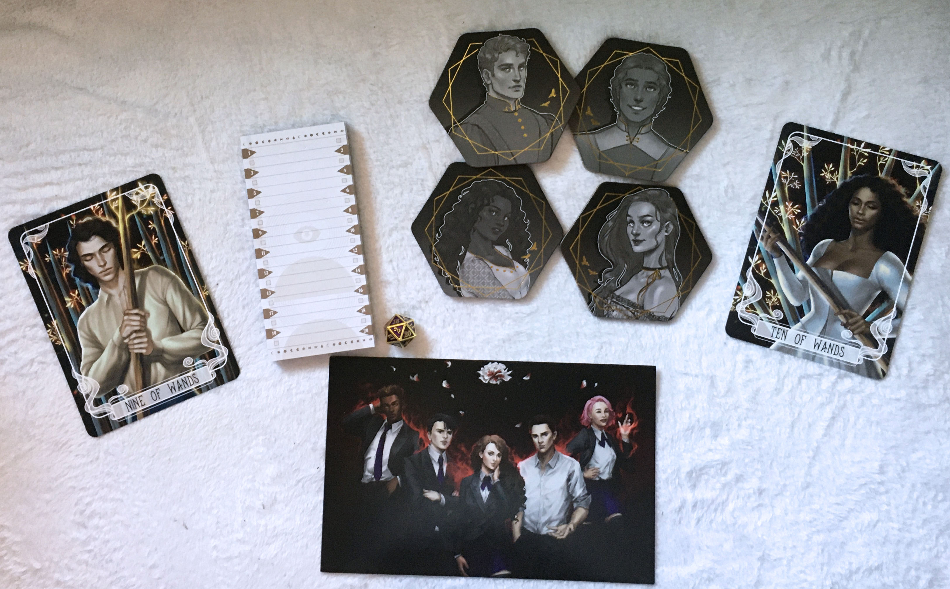 The bookish items included this month are a Throne of Glass inspired tumbler, a wooden phone stand, Serpent and Dove foiled coasters, a Crave art print, the monthly tarot cards, and the TBR Game. The TBR Game came with a pad of number paper and a 20 sided die, you write down books that you are interested in and then roll the die to determine which one you will read.