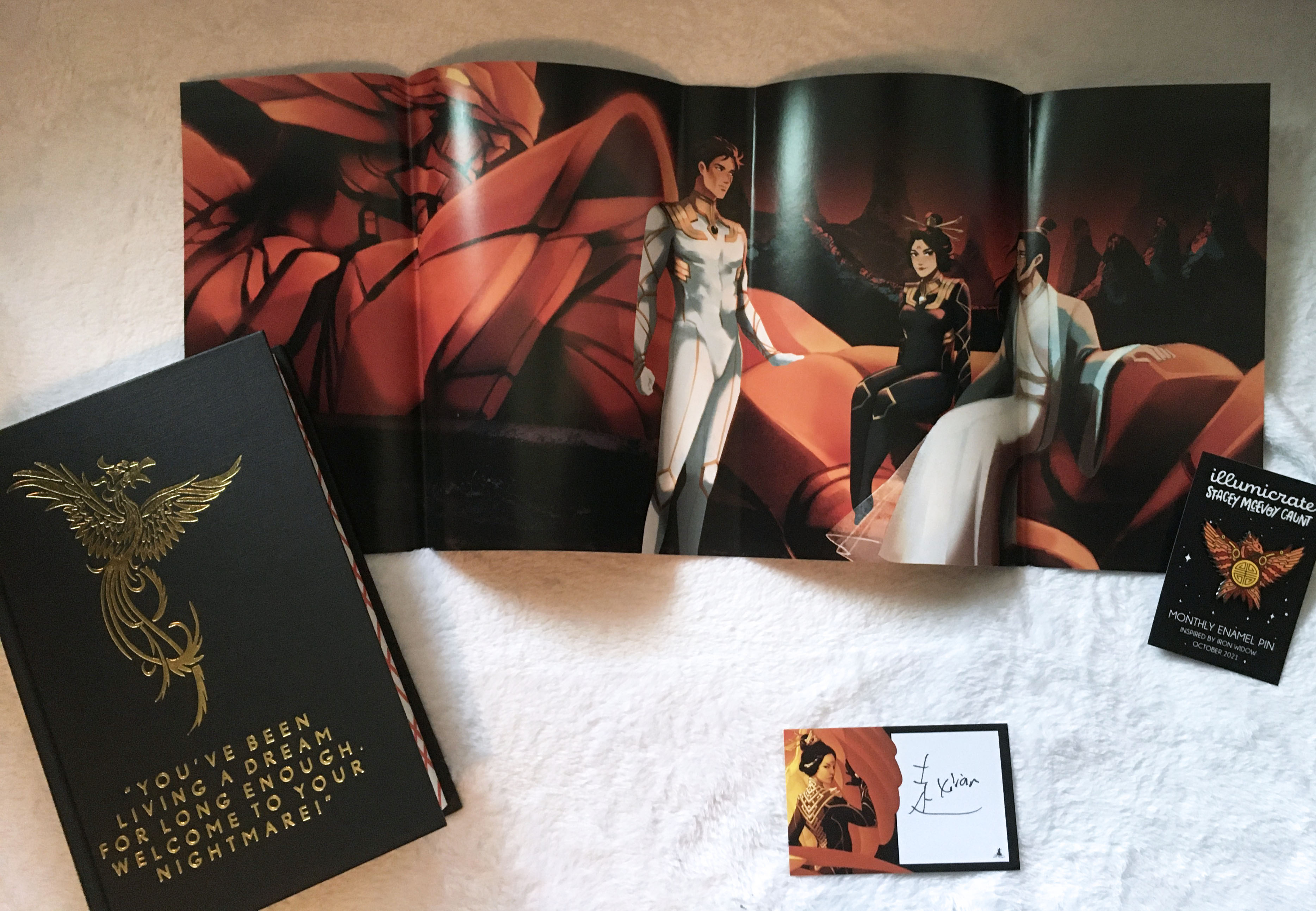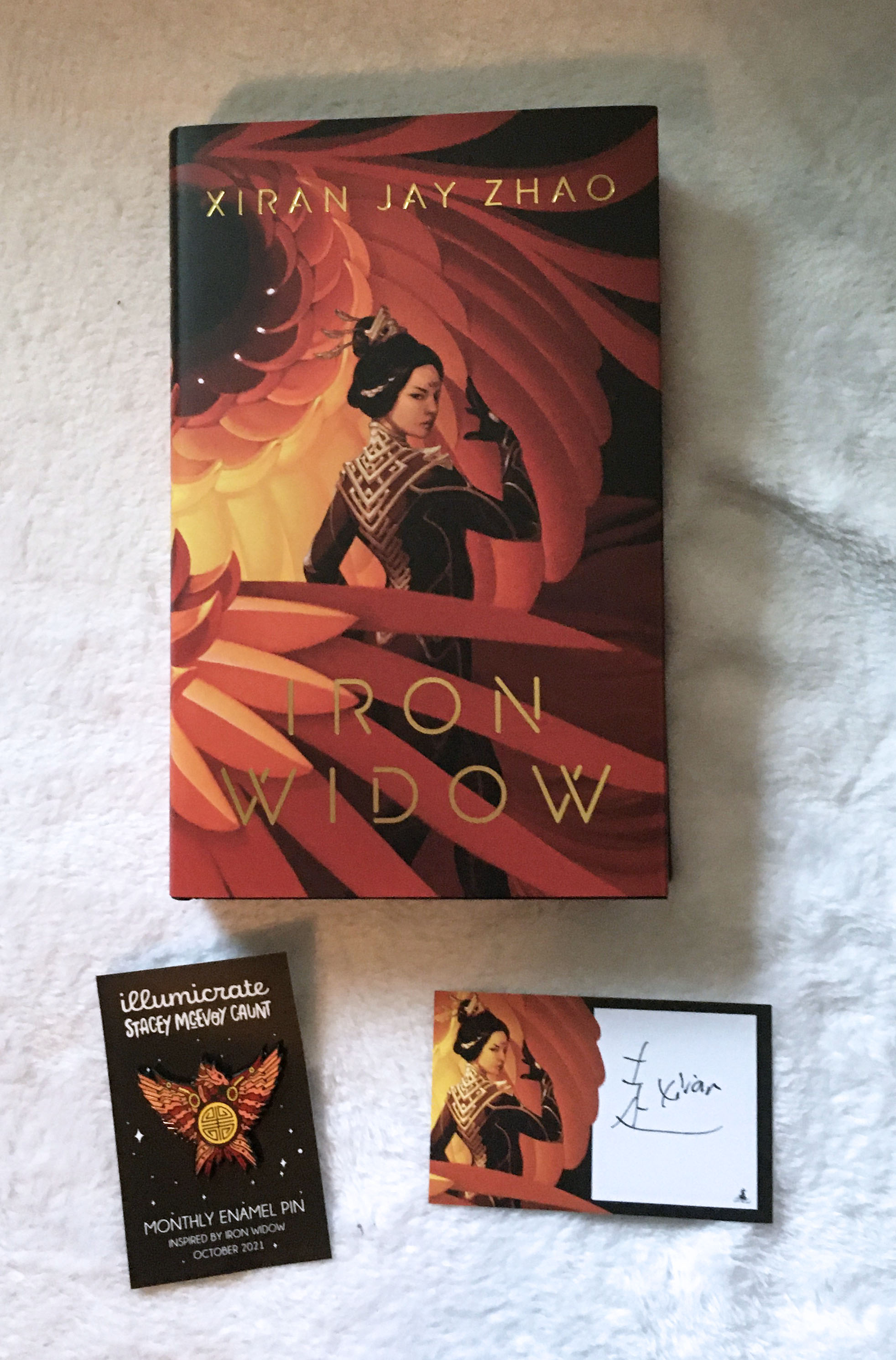 Illumicrate, like other book boxes, include a new hard cover each month and most months a letter from the author. This months book is Iron Widow by Xiran Jay Zhao which I’ve seen described as Pacific Rim meets The Handmaid’s Tale while retelling the rise of China’s only female emperor Wu Zetian. Which is all I needed to know to want to read this book. This special edition has stenciled edges, foiling on the hardcover, art on the back of the dust jacket, and a digital signature. The monthly pin is also inspired by the book.