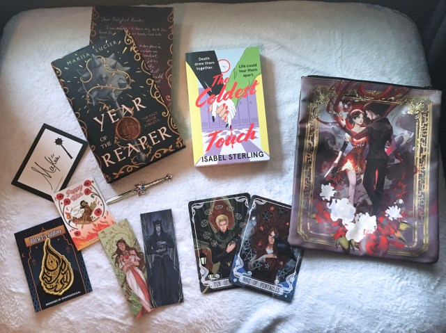 All Fairyloot books come with exclusive covers, signed by the author and include a letter from the author. This month the hardback book is Year of the Reaper by Makiia Lucier which also has black sprayed edges, art on the reverse of the dust jacket, and foiling on the hardback. This is a fantasy with ghost and romance in a world where the kingdom could be forced back into war. This month Fairyloot also include a new paperback book The Coldest Touch by Isabel Sterling which is a paranormal romance between Elise, who sees how people will die, and Claire, a vampire.
