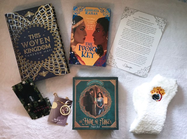 Illumicrate, like other book boxes, include a new hard cover each month and most months a letter from the author. This months book is This Woven Kingdom By Tahereh Mafi which follows Alizeh, the heir to the Jinn Kingdom, who is hiding as a servant and Kamran the crown prince who is prophesized to die and doesn’t realize that a servant girl will change everything. This special edition has a exclusive naked hardcover and digitally printed edges.