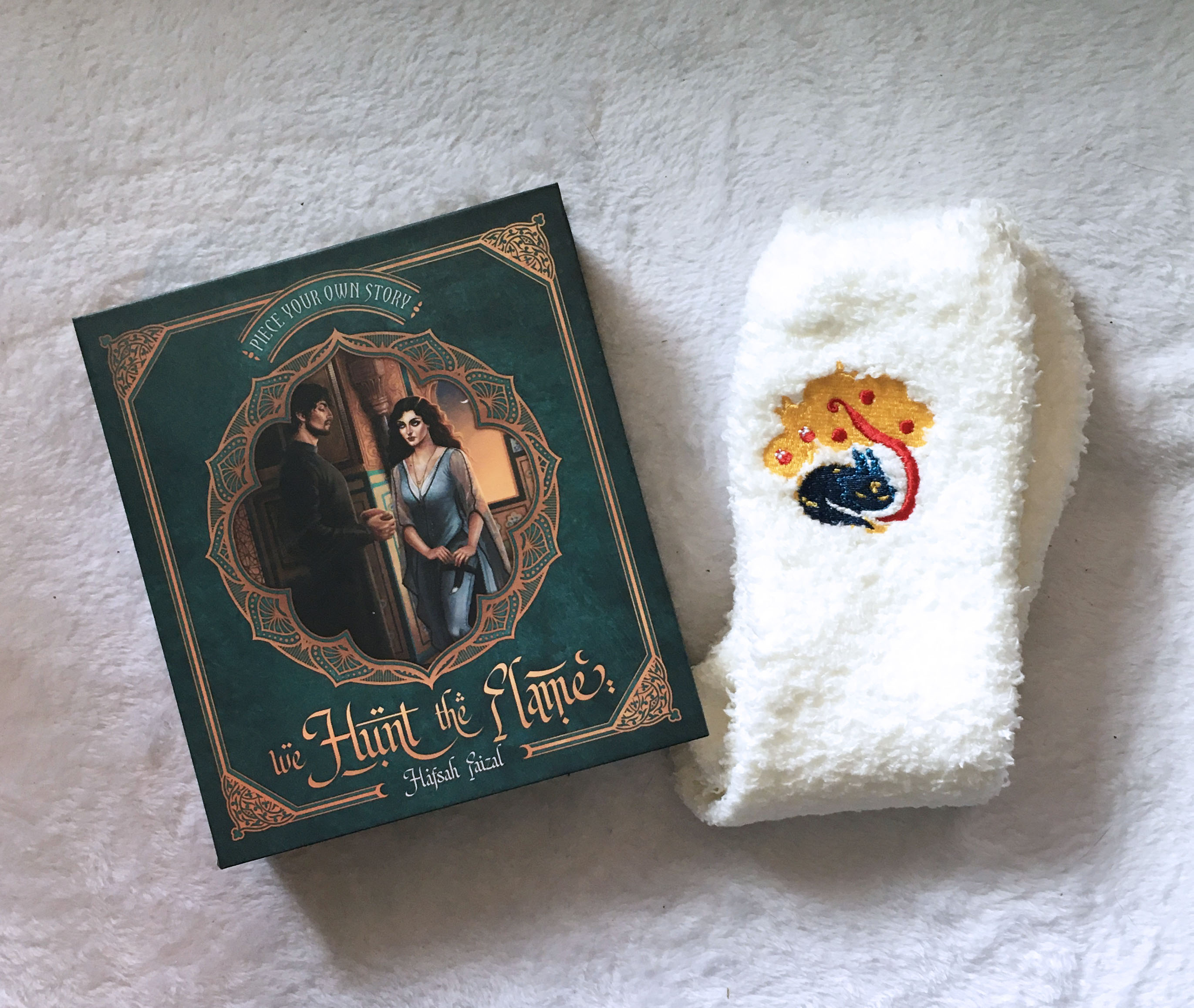 The items included in this box are a We Hunt the Flame Puzzle, a set of fluffy socks, a phone holder inspired by The Prison Healer, and a spinning pendant inspired by The Never-Tilting World.