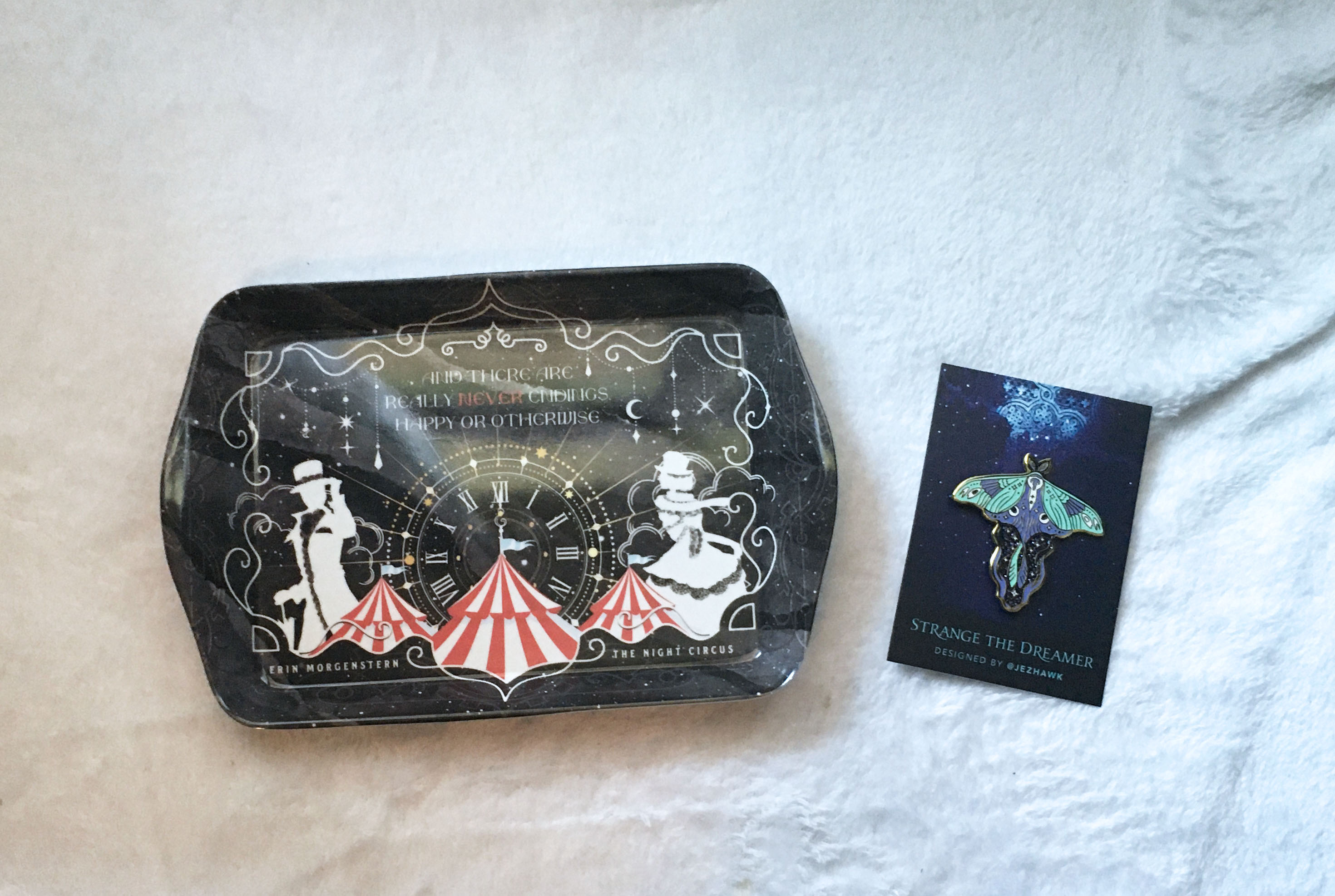 The bookish items included this month are a Night Circus tray, a set of heart shaped fairy lights, a Strange the Dreamer enamel pin, a canvas basket, and the set of playing cards that was delayed from March’s box. The tarot cards include character art from Daughter of the Moon Goddess. This month there is also an extra paperback book, An Arrow to the Moon by Emily X.R. Pan. This book is a modern retelling of Romeo and Juliet with Chinese mythology.