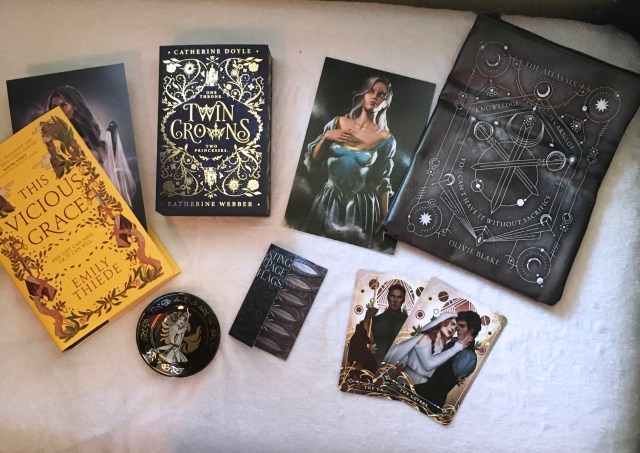 All Fairyloot books come with exclusive covers, generally signed by the author and include a letter from the author. This month the book is This Vicious Grace by Emily Thiede which follows Alessa who’s gift from the gods is supposed to magnify a partner’s magic but when a powerful priest convinces the faithful that killing her is their only hope against the demons Alessa must team up with Dante to try to master her gift and save her people. This edition also has stenciled sprayed edges, foil on the hardcover, and artwork on the endpapers.