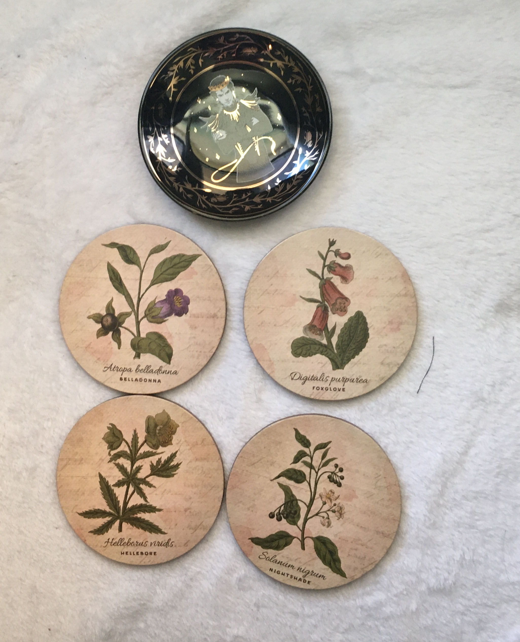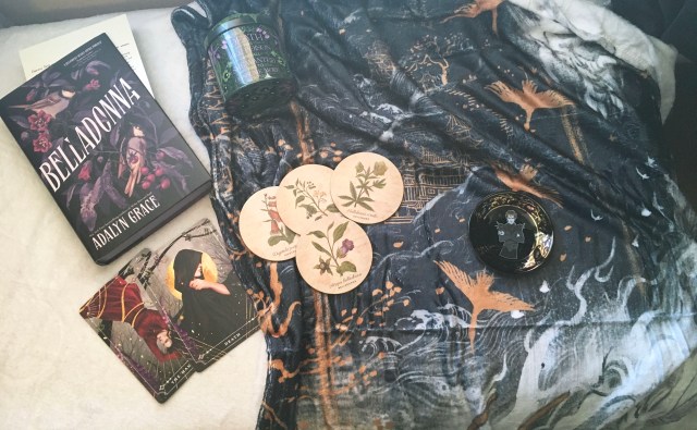 The bookish items included this month are a set of coasters, a trinket dish featuring Cardan from the Folk of the Air series, a tea tin inspired by this months book, a Sic Crimson Cranes blanket, and the tarot cards have character art from Belladonna by Adalyn Grace.