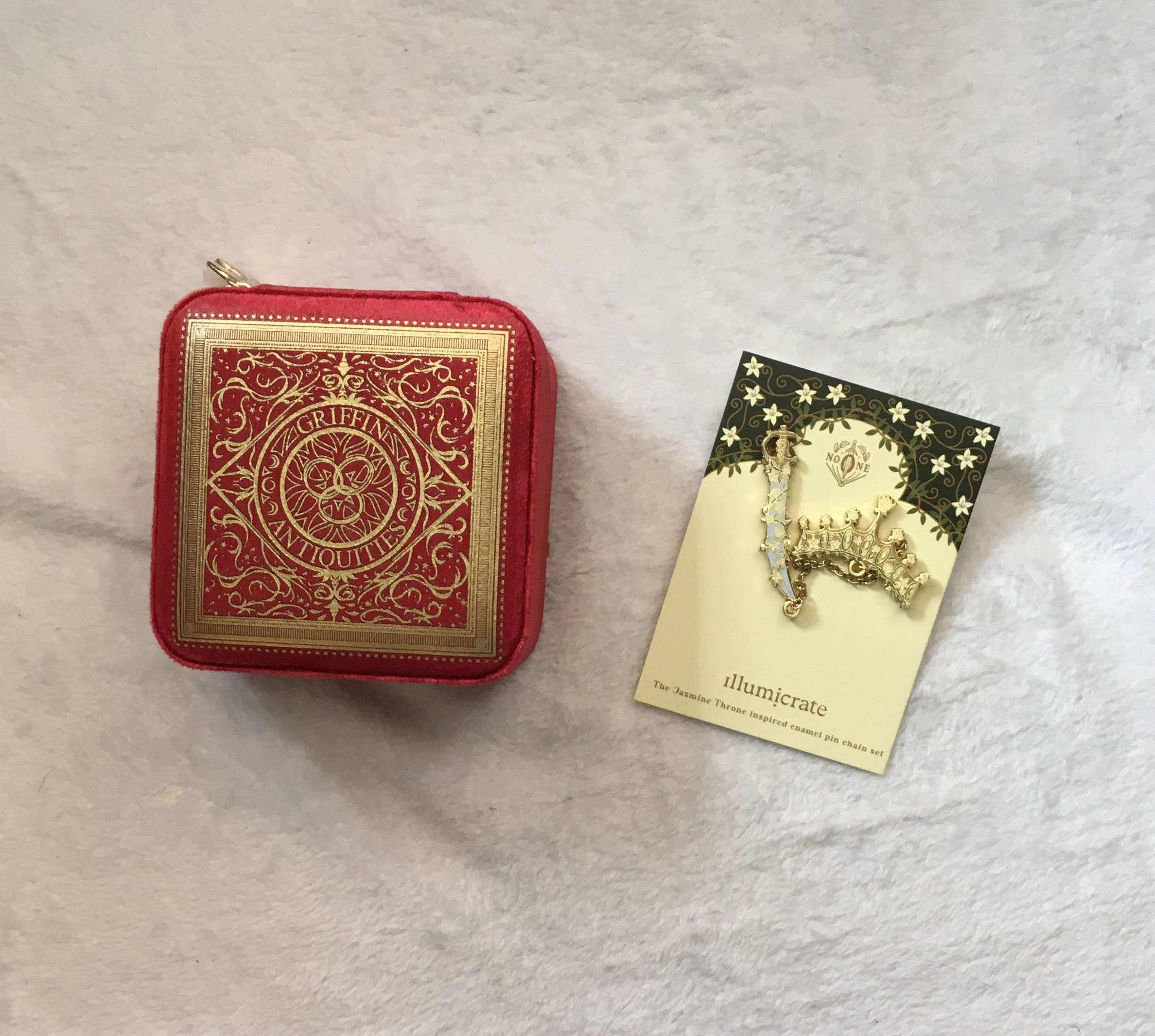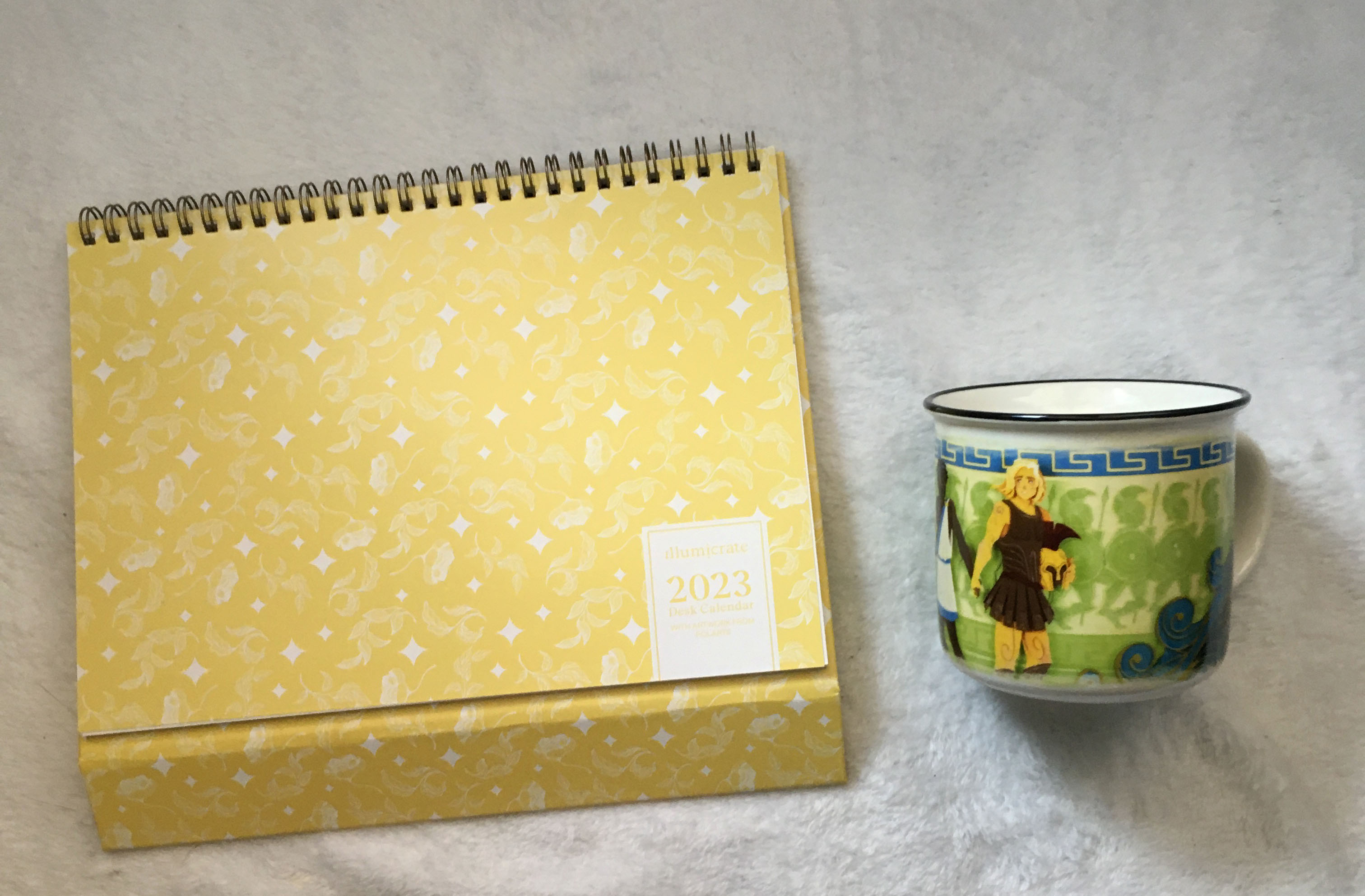 The items included in this box are a mug inspired by the Song of Achilles, a 2023 desk calendar featuring couples from different series, a jewelry case inspired by House of Earth and Blood, and a chain pin set inspired by the Jasmine Throne.