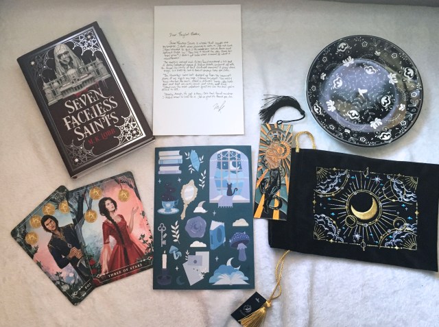 All Fairyloot books come with exclusive covers, generally signed by the author and include a letter from the author. This month the book is Seven Faceless Saints by M.K. Lobb which is a murder mystery in a dark fantasy world where a dark power threatens to devour everything. This edition also has digital sprayed edges, artwork on the endpapers, and foiling on the hardback.