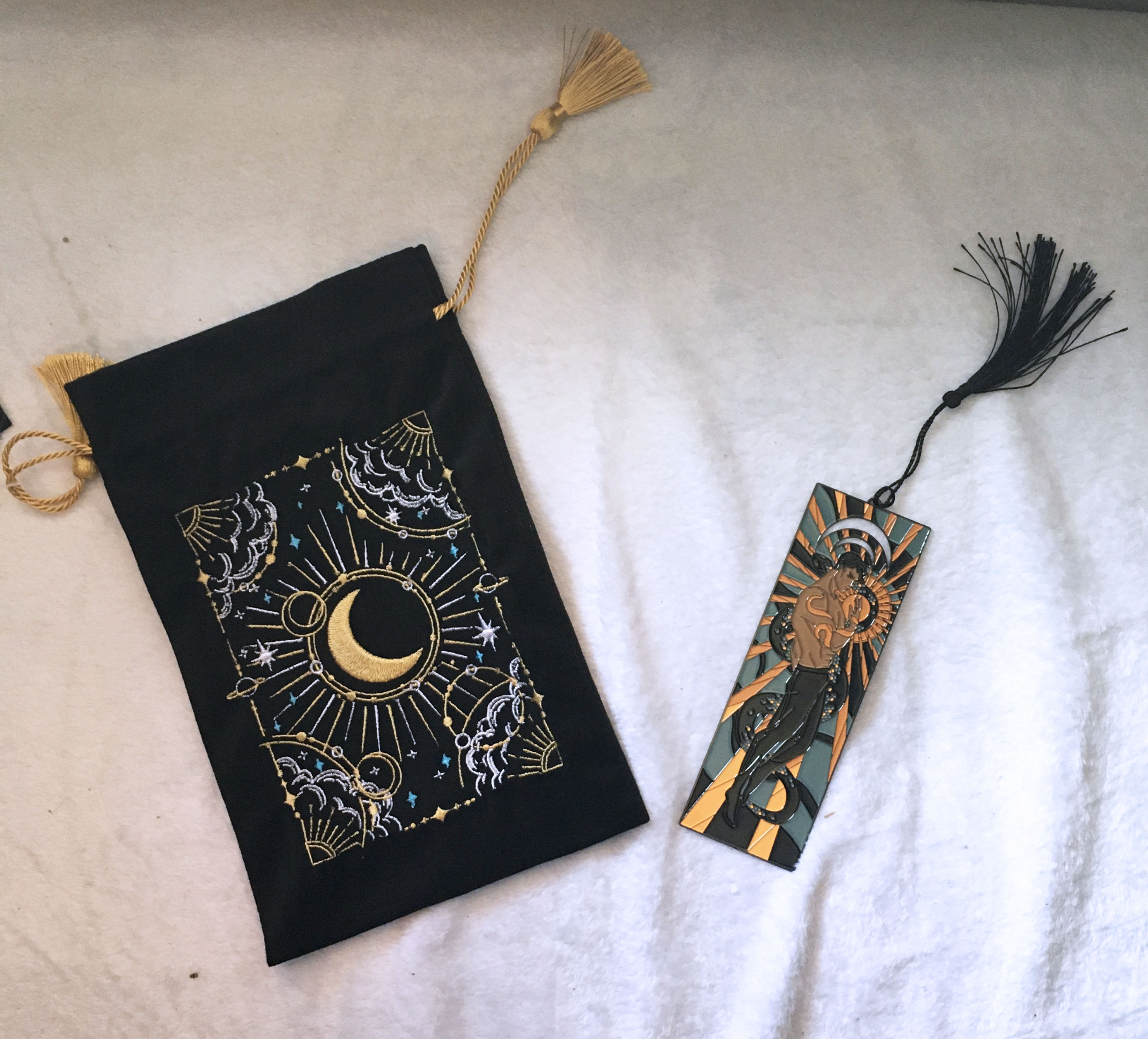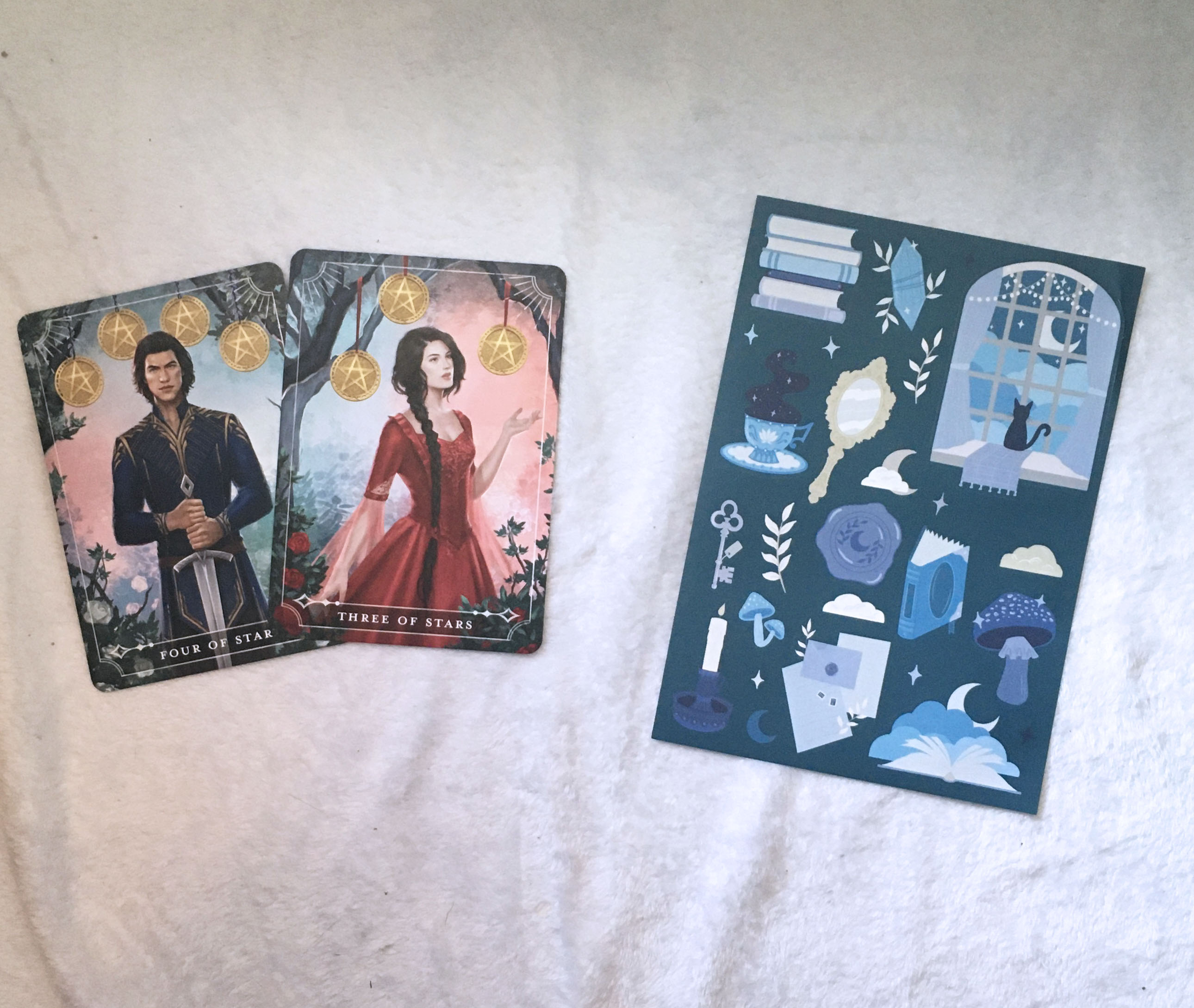 The bookish items included this month are a ceramic plate inspired by the Winternight trilogy, a metal bookmark, a bookish sticker sheet, and a tarot card pouch. The monthly tarot card features character art from One Dark Window.