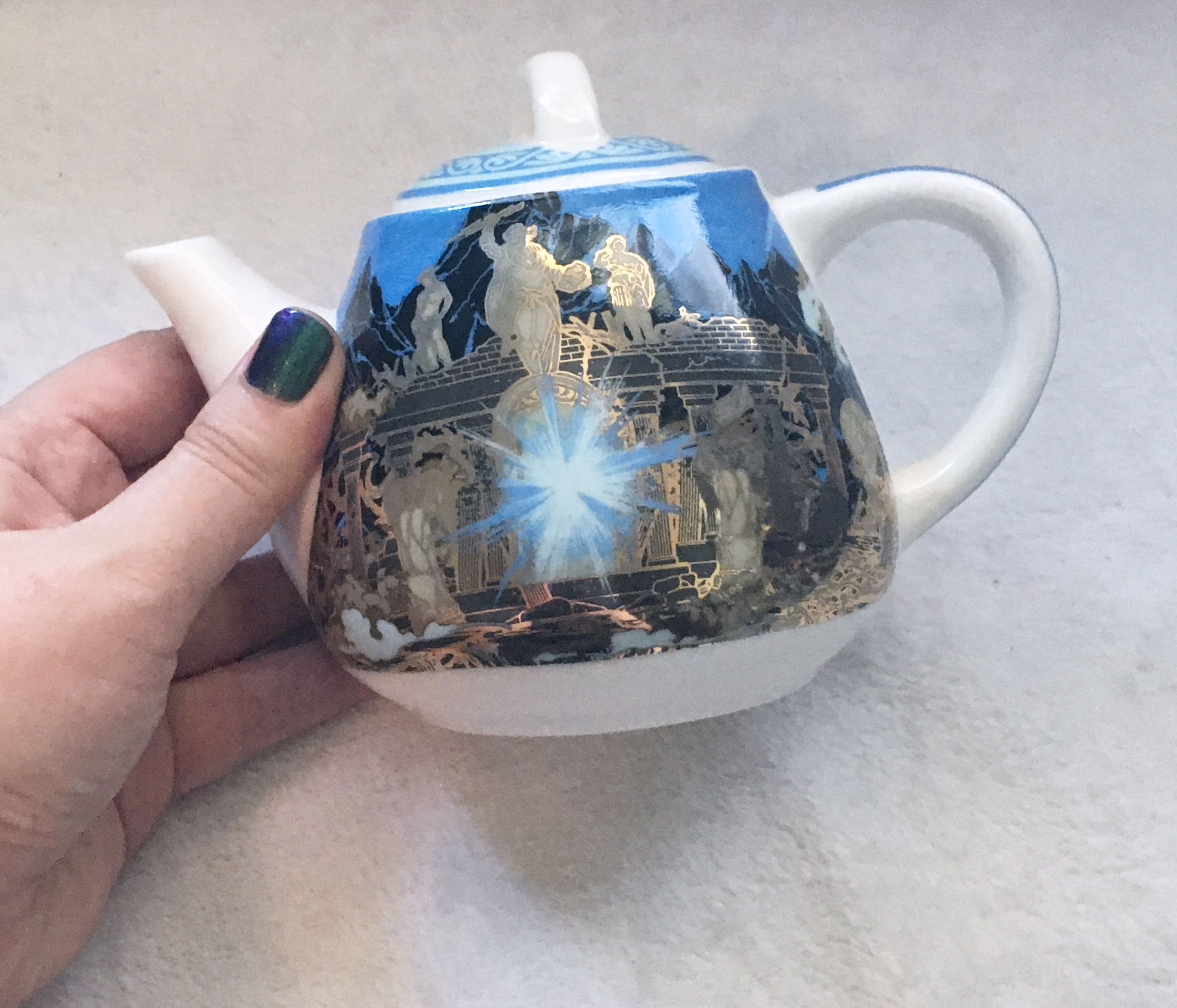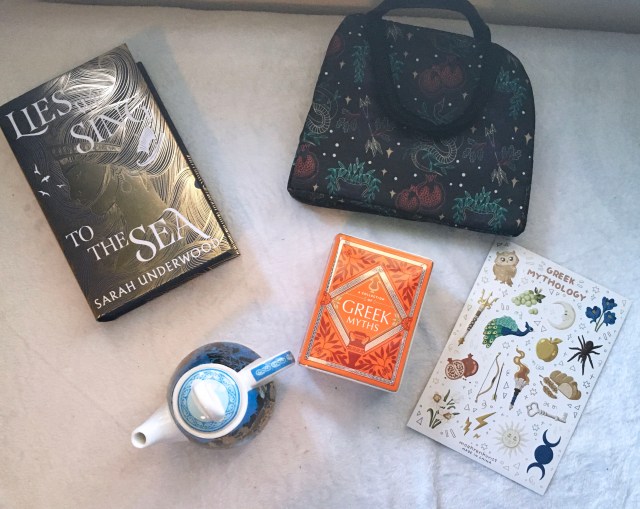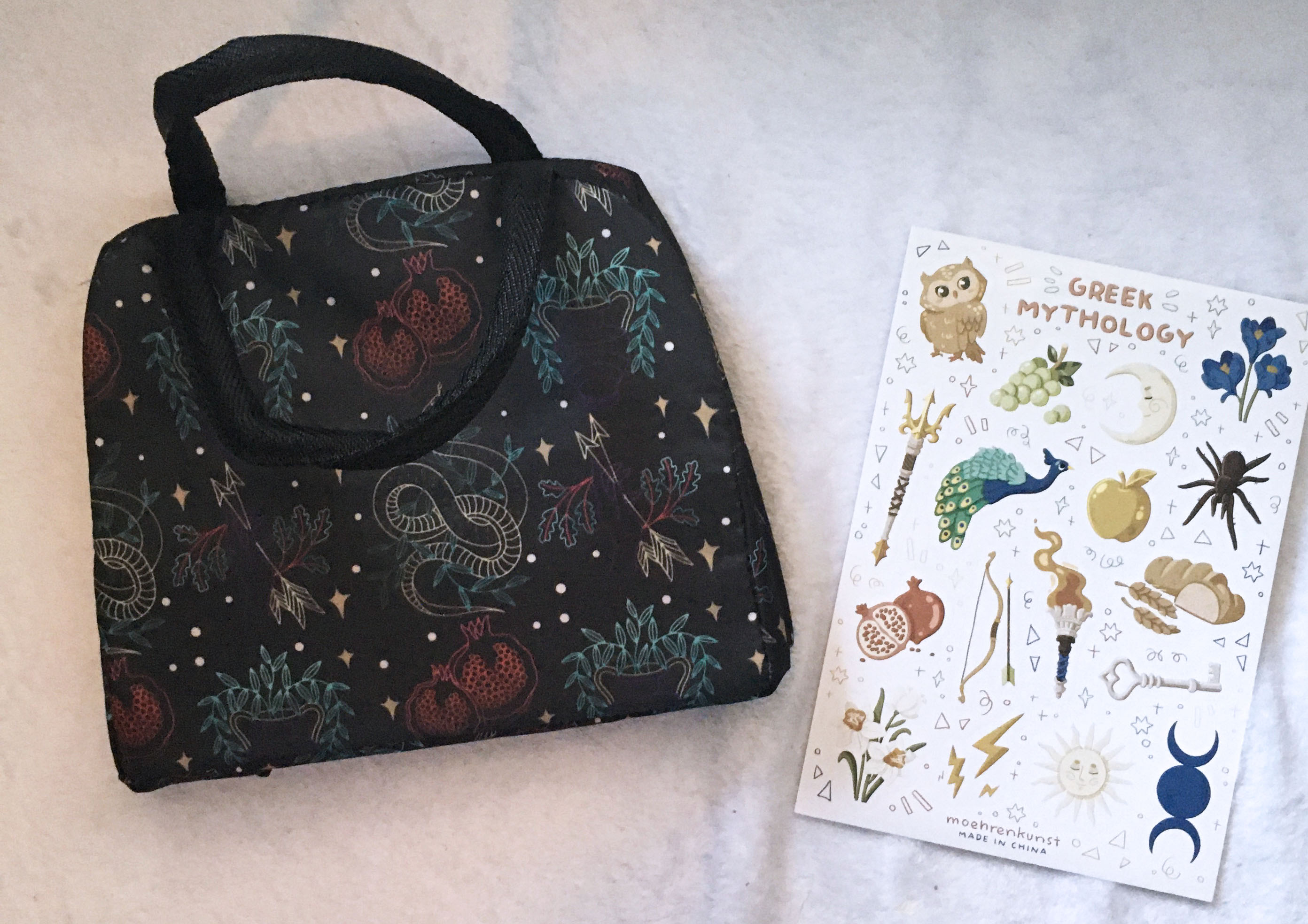 The items included in this box are a Greek mythology mini teapot, a book pot, a sticker sheet inspired by Greek mythology, and a lunch bag.