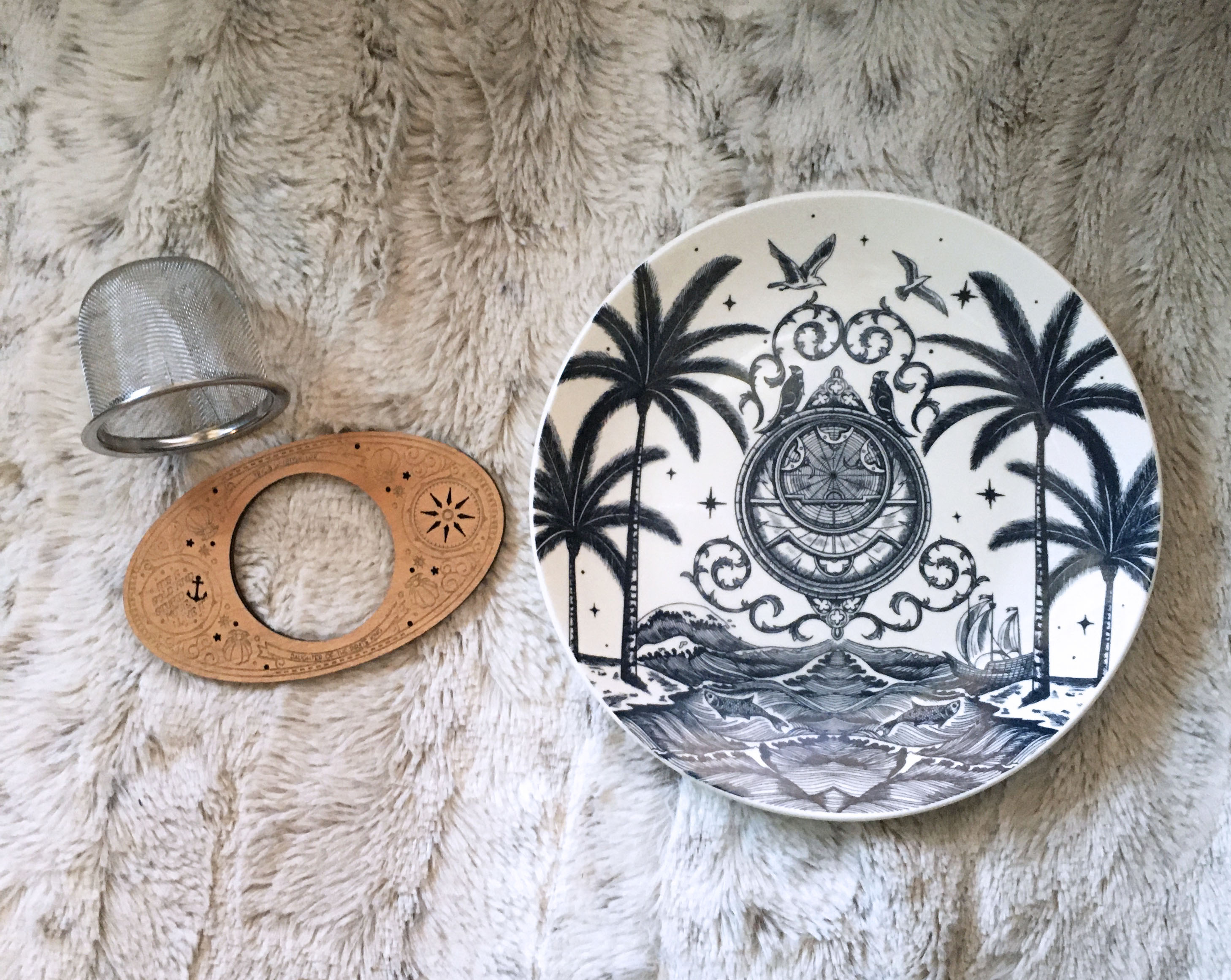 The bookish items included this month are a ceramic plate, a Daughter of the Pirate King inspired tea strainer, the next mythology bookmarks, reusable cotton face pads, and a cushion cover. The monthly tarot card have character art from Song of Achilles.