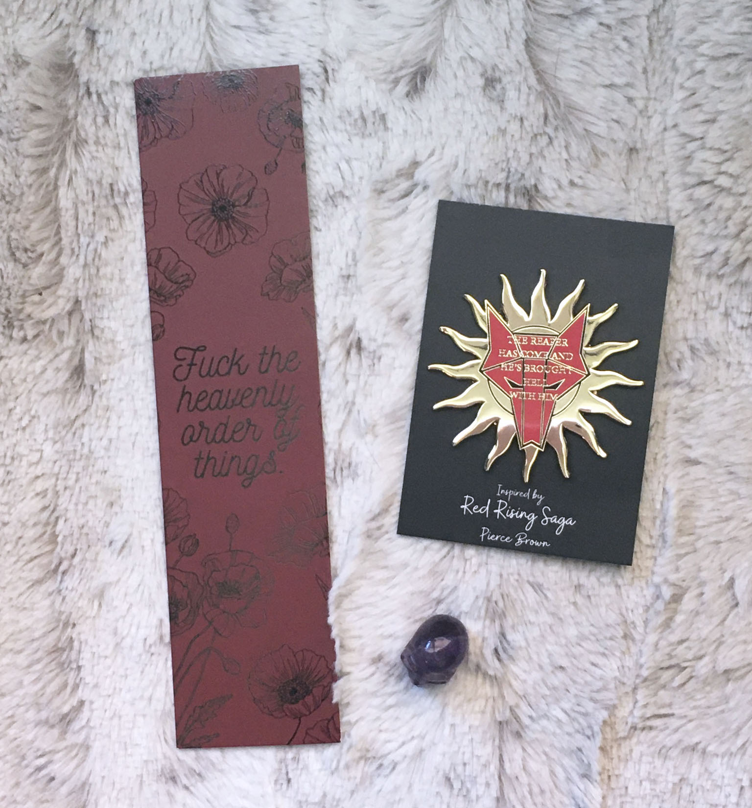 The items included in this box are a Nevernight inspired T shirt, a Poppy War double sided bookmark, a Red Rising enamel pin, a Carrie inspired bath oil, and a Hell Followed Us inspired candle. The crystal this month was amethyst which was shaped like a skull.