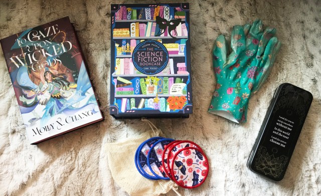 The items included in this box are a bookcase puzzle, a bookmark tin, a set of reusable makeup remover pads, and a pair of gardening gloves.