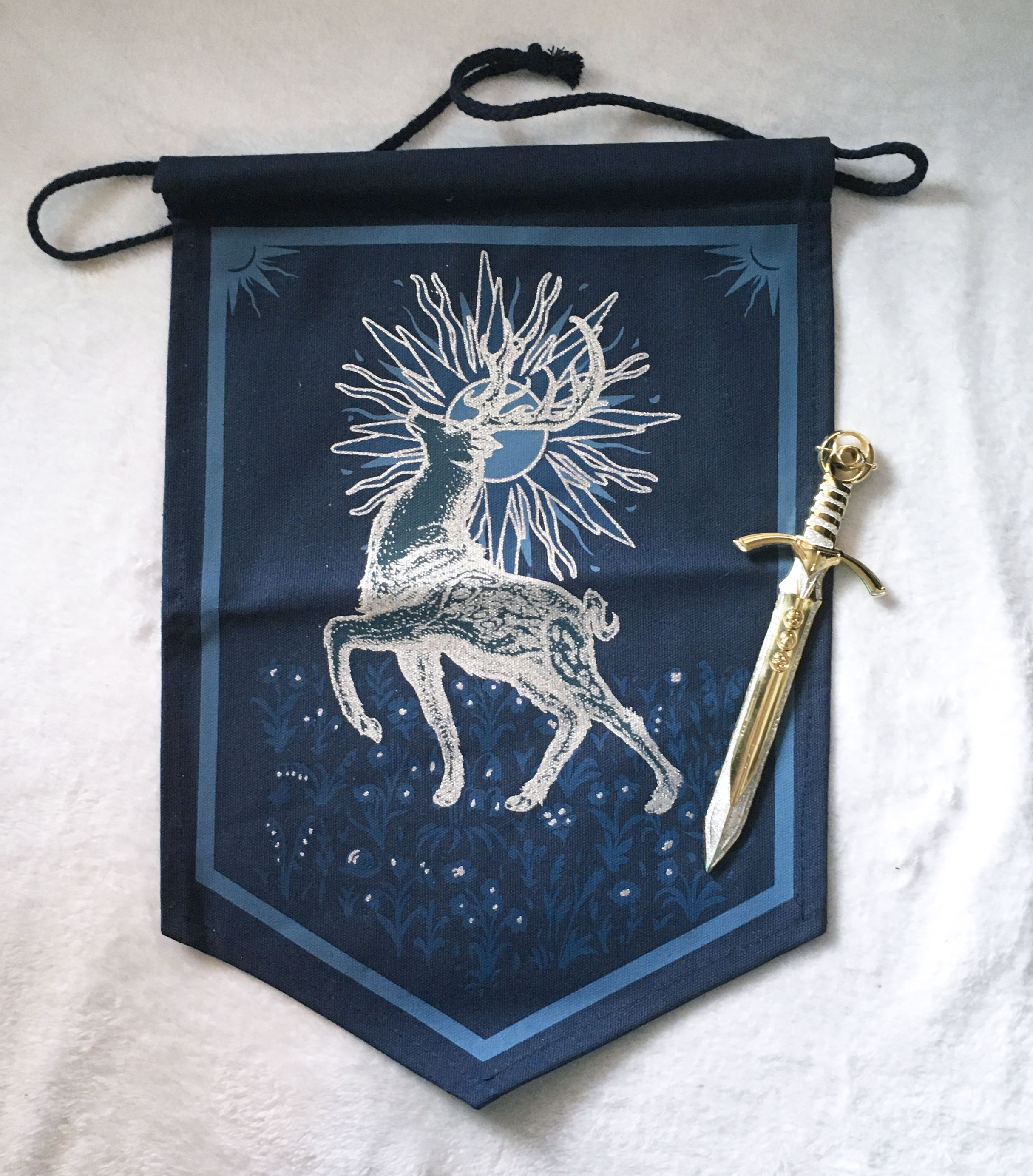 The items included in this box are a towel with art work inspired by the Hunger Games, a guess the character card game, a set of stemless tea cups, and an embroidered pouch for playing cards or tarot cards.
